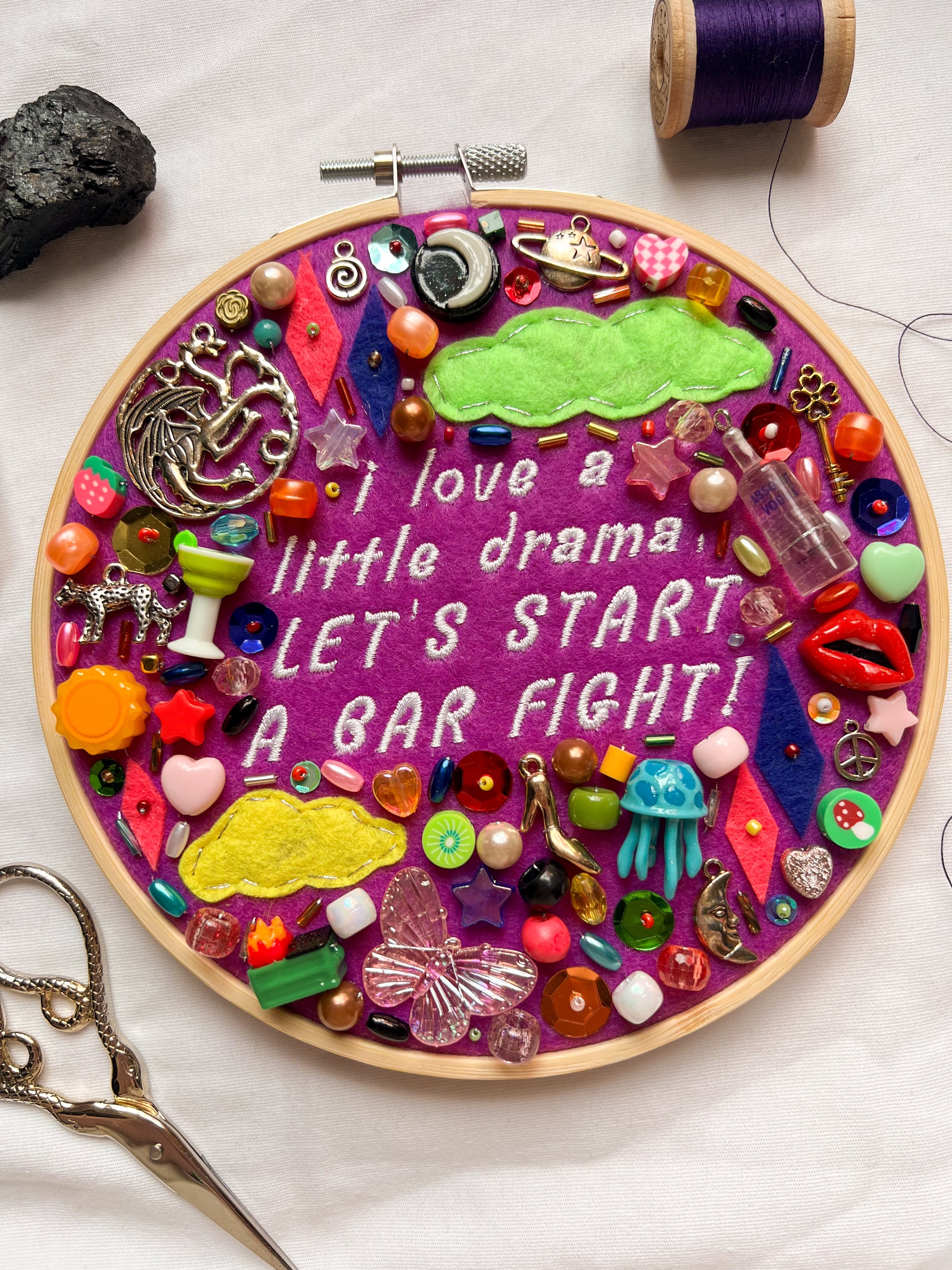 embroidery hoop with lyrics from chappell roan’s song “after midnight”: "I love a little drama, let's start a bar fight!" machine-embroidered in white thread. bright purple felt background with various colors and types of beads, charms, and embroidered details. 6” embroidery hoop