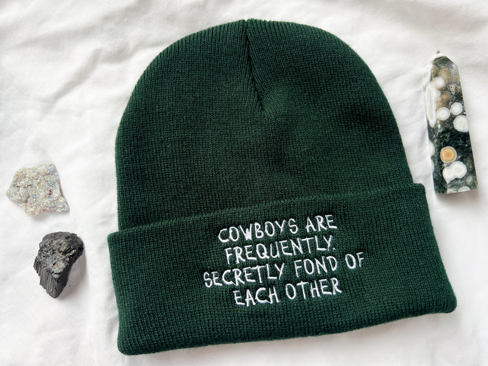 machine-embroidered quote in white or black thread. lyrics from willie nelson’s song: “cowboys are frequently secretly fond of each other”