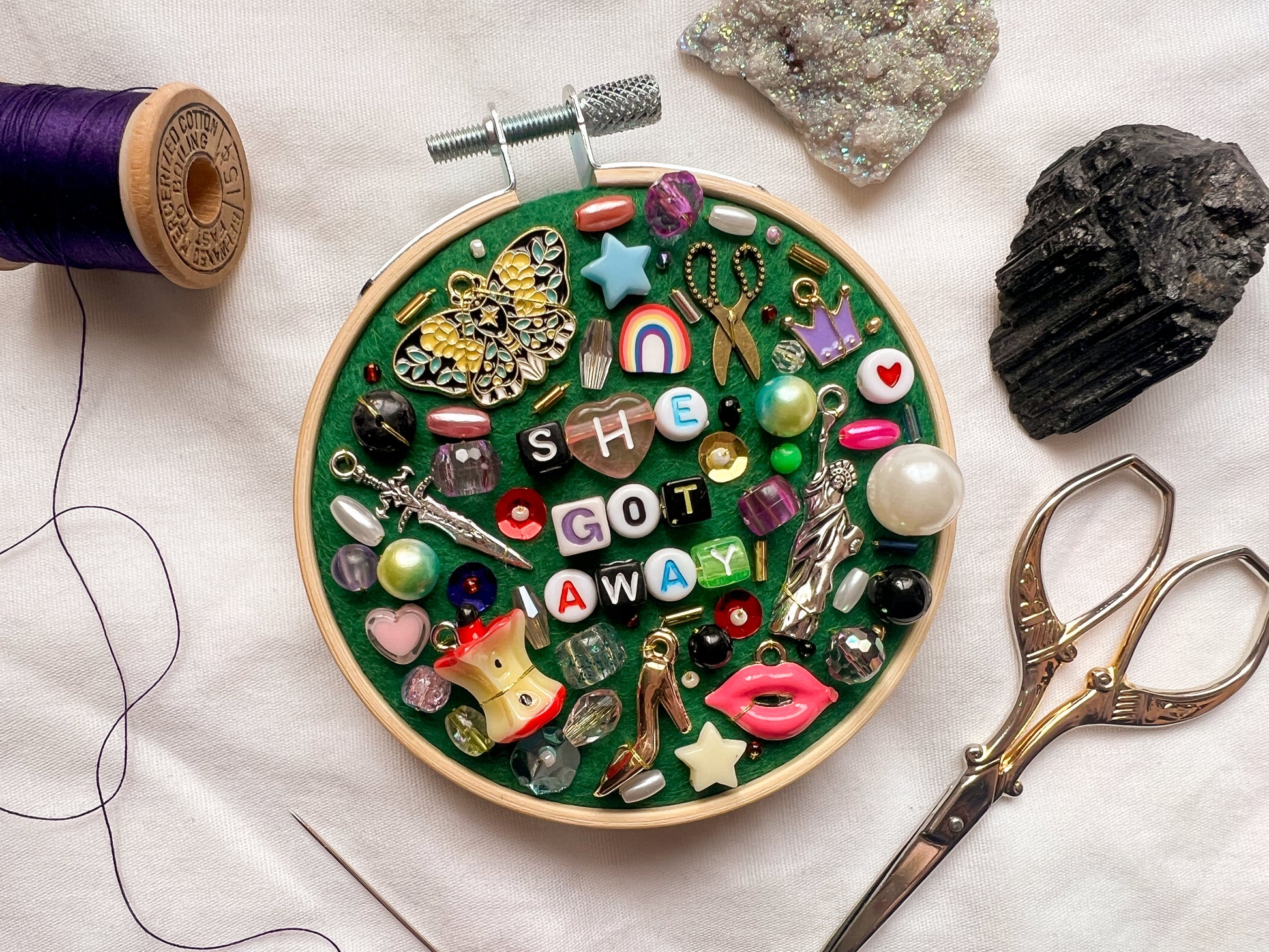 embroidery hoop with lyrics from chappell roan’s song “the subway”: “she got away" spelled out in letter beads. dark green felt background with various colors and types of beads, charms, and embroidered details. 3” oval embroidery hoop