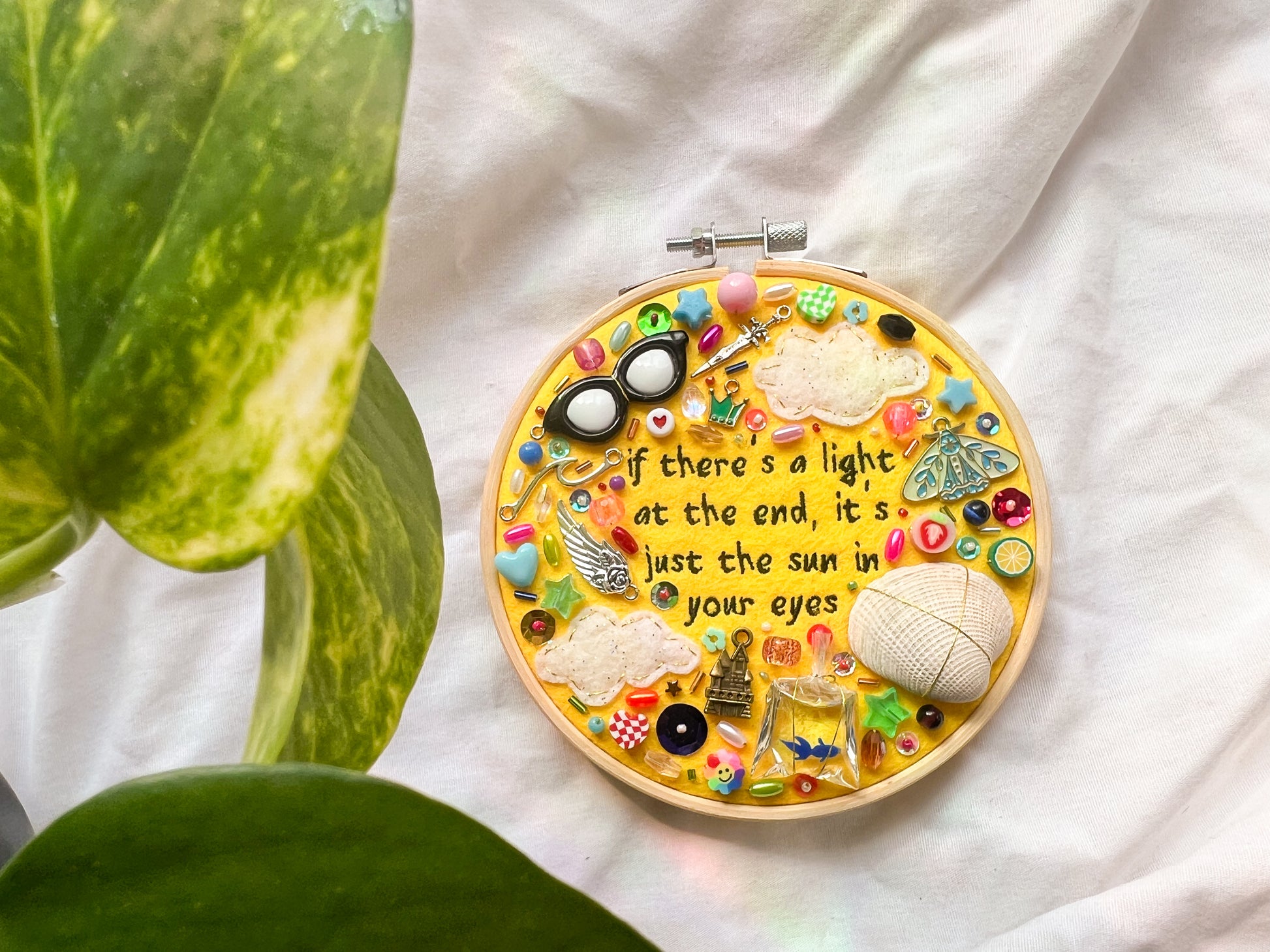 embroidery hoop with lyrics from halsey's song "young god": "if there's a light at the end, it's just the sun in your eyes" machine-embroidered in black thread. yellow felt background with various colors and types of beads, charms, and embroidered details. 5" embroidery hoop